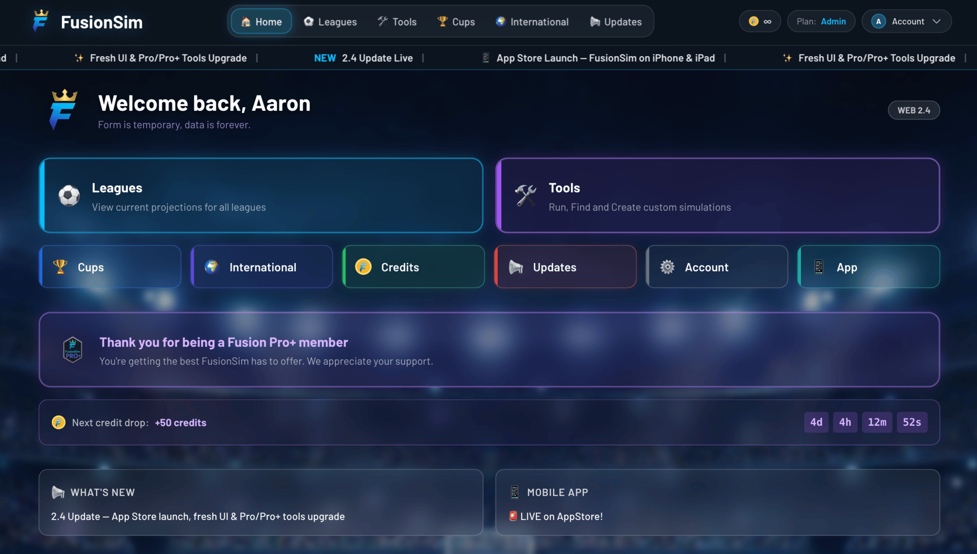 A new facelift to FusionSim for the home page. If you’re a Pro or Pro+ subscriber, you’ll get a little thank-you each time, and you’ll be able to see when the next credit drop is and how many you’ll be getting.