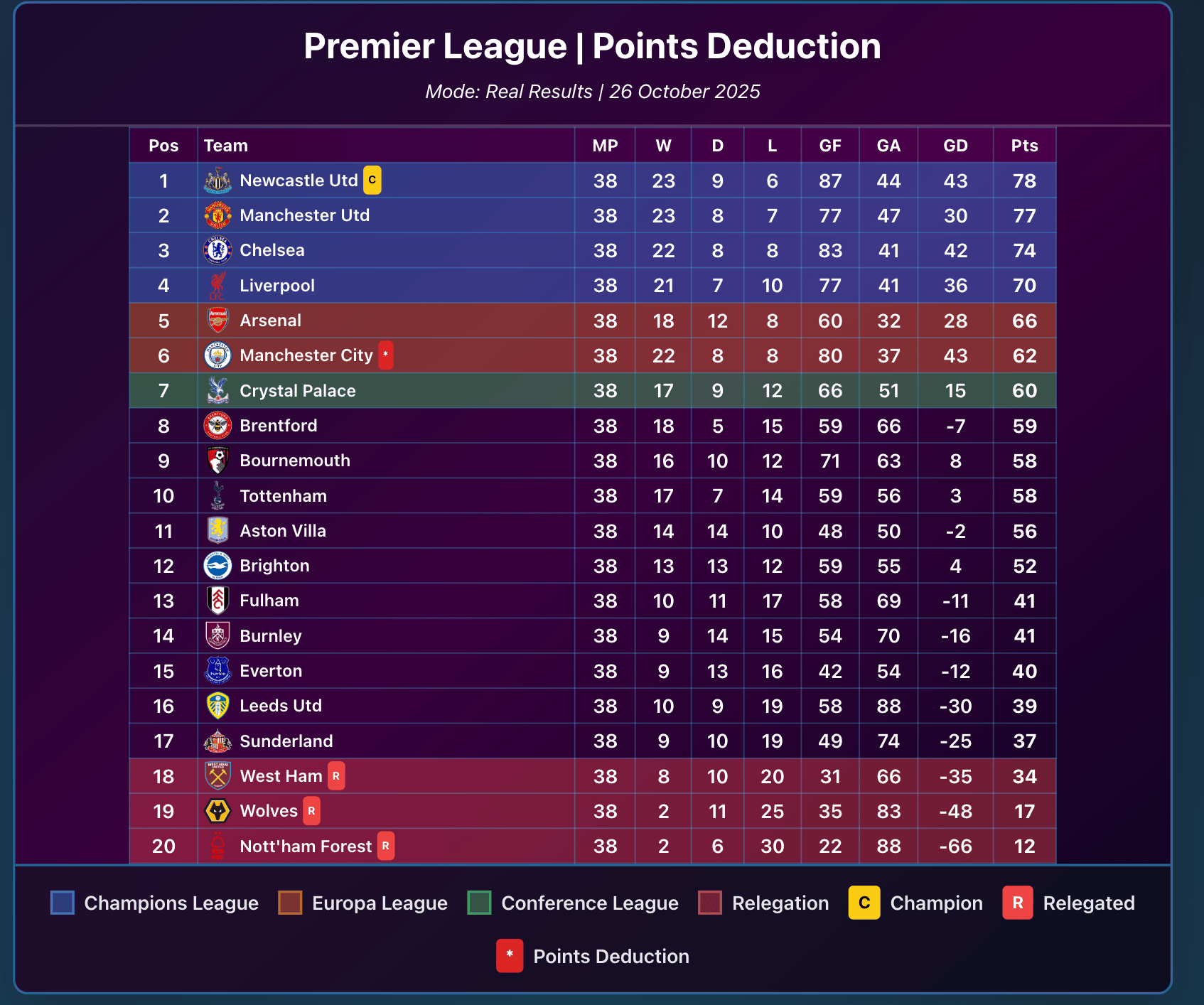 In the example above, I took away 12 points from Manchester City, yes it’s a very strange table as somehow Newcastle win the Premier League!