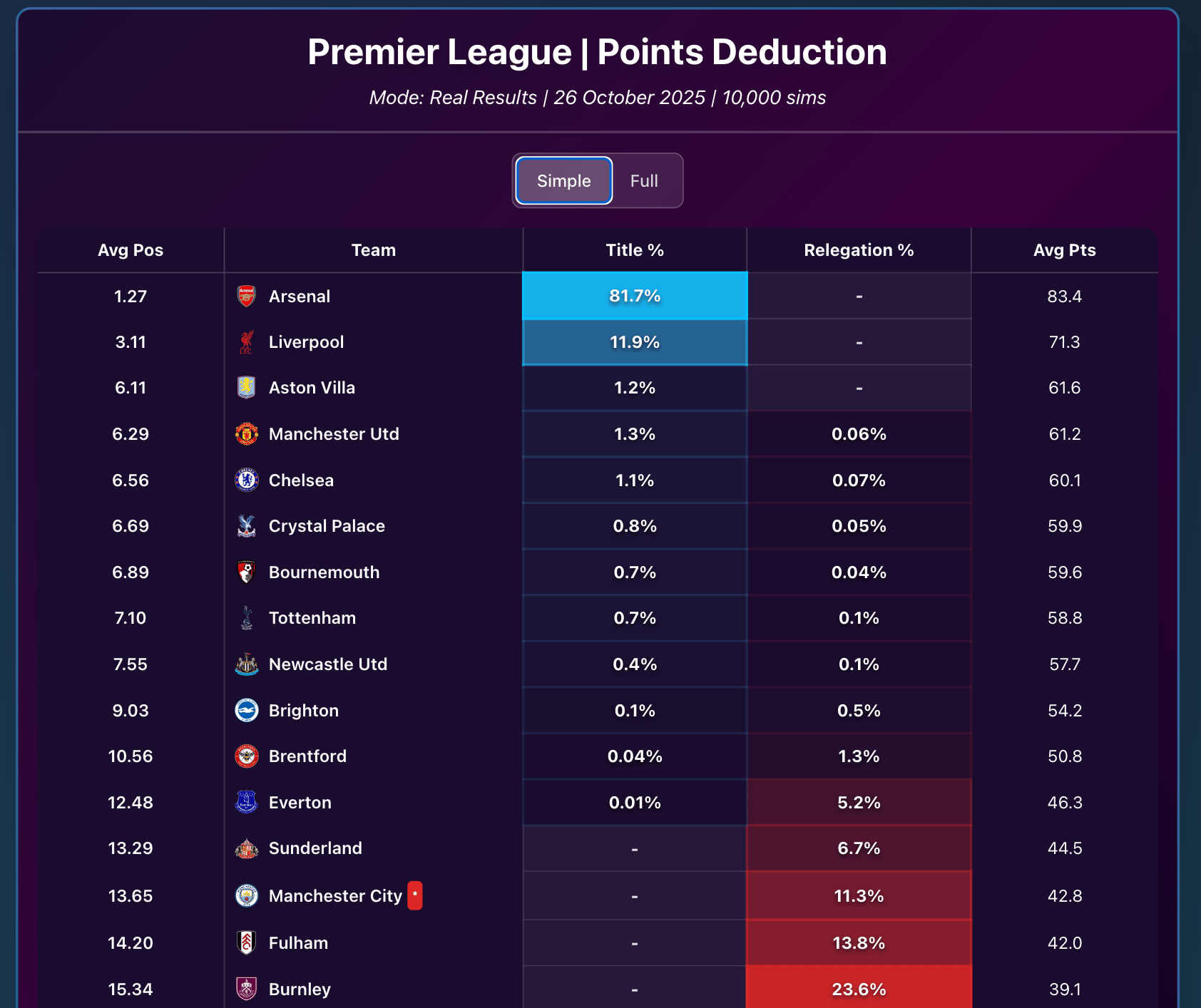 Below is another example of it but for the % chance, this time I kept it in the ‘Real Results’ mode, but deducted 30 points from Manchester City.