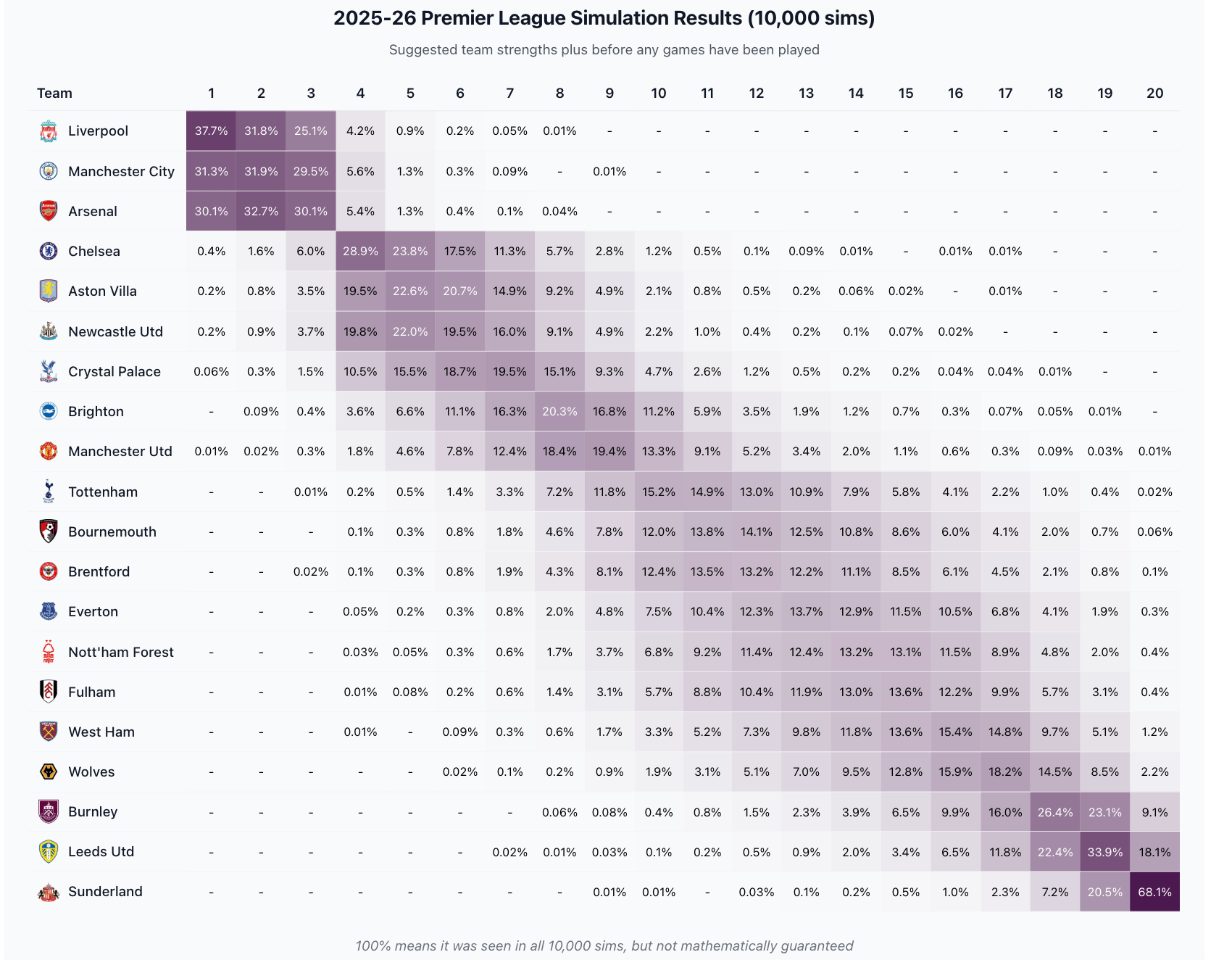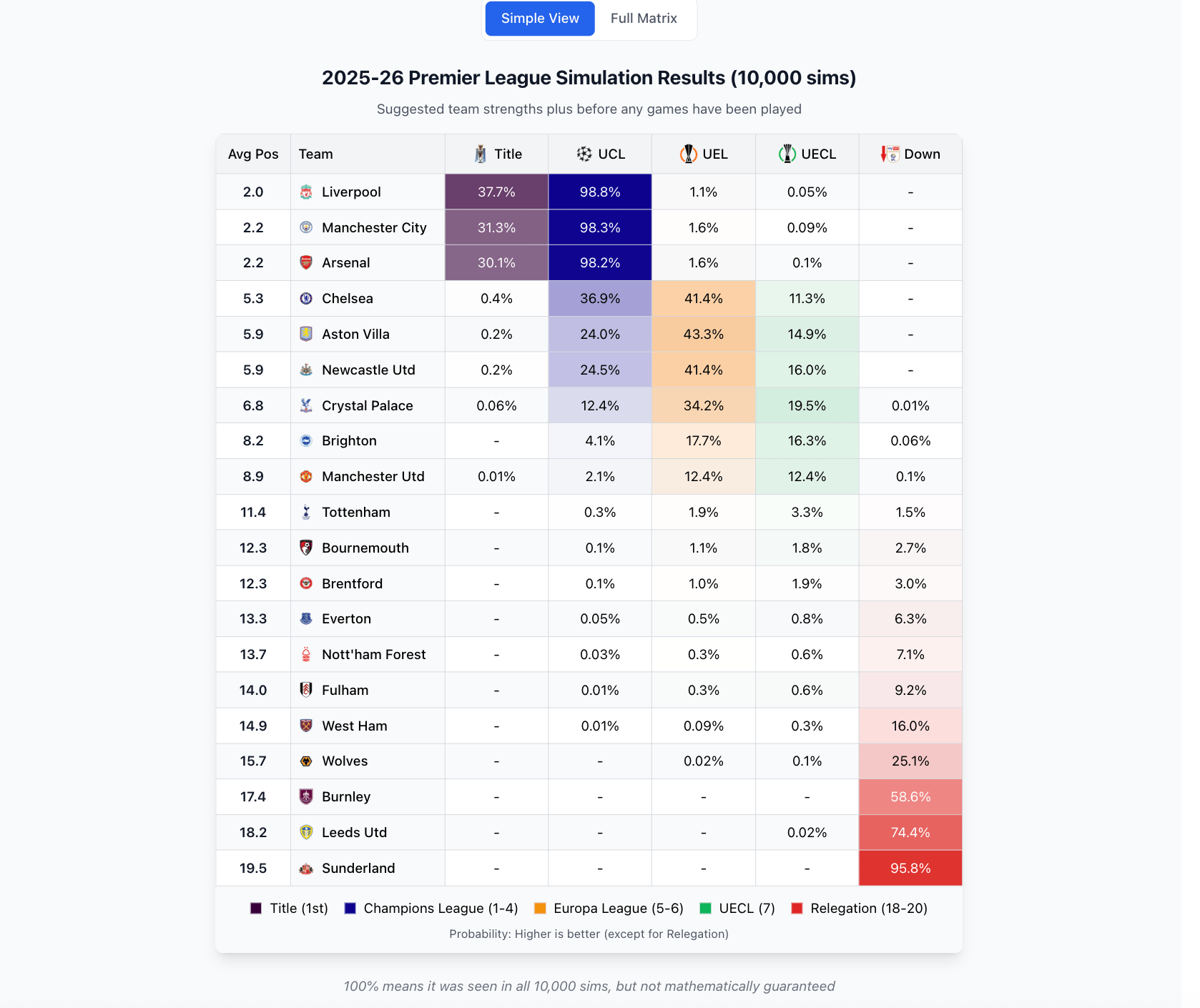 You can use custom team strengths from currently just the Premier League to see how changing the strengths of teams changes their likelihood of finishing where. Meaning, if you think I rate a team too high or low, you can adjust their strength and see how it changes their probabilities over thousands of simulations.