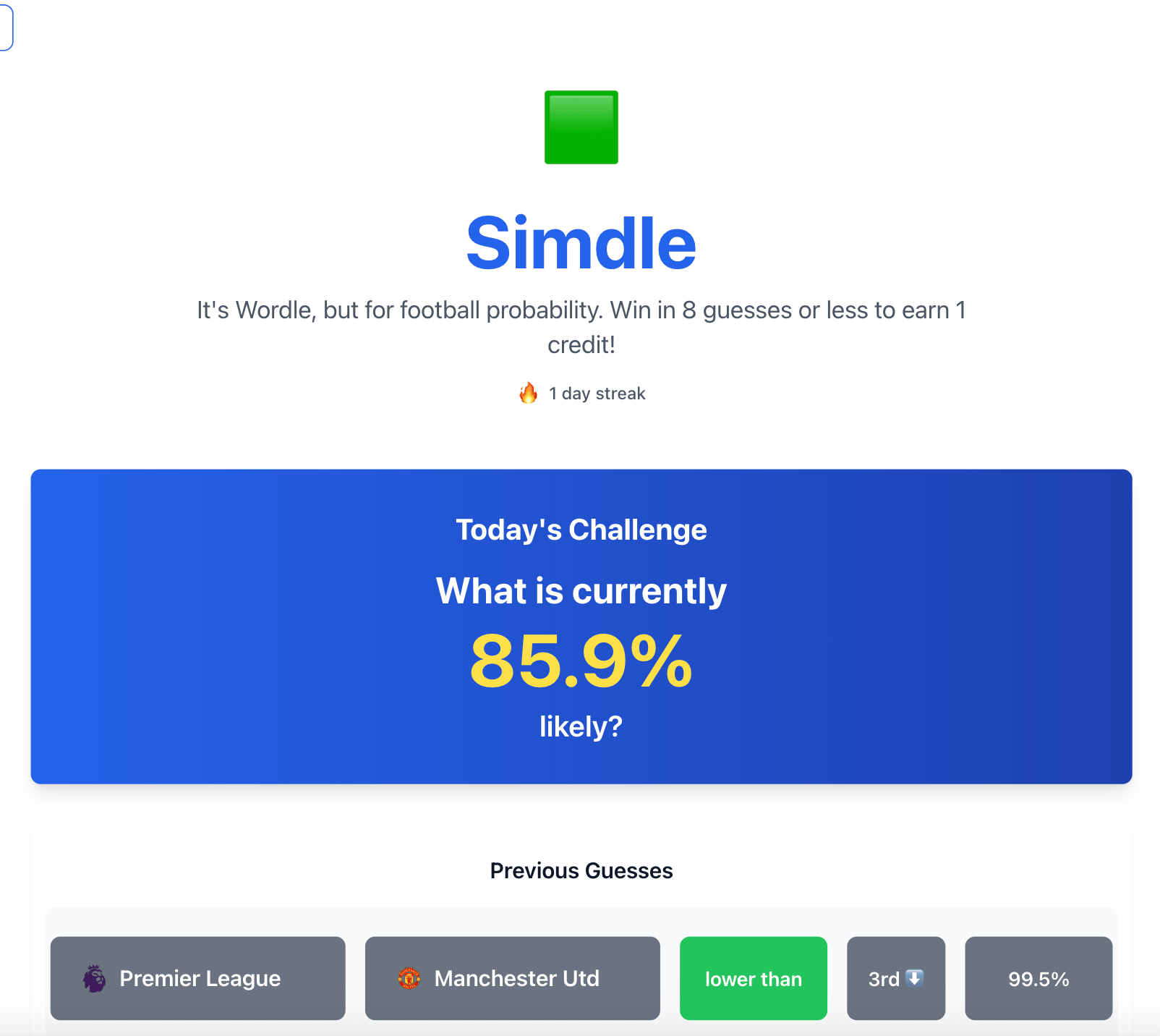 The goal of this first of many mini game modes, was to give users a way to earn some free credits each day. As the subtitle suggests, it’s like Wordle but with a current football probability.