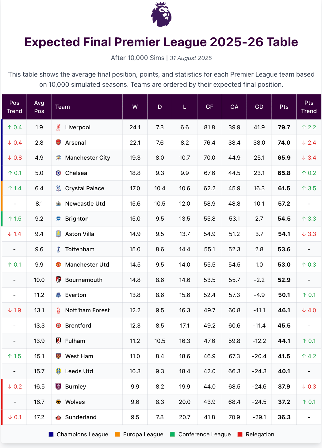 Fusion Sim 1.0 Model is finally here, trust me it’s 100 times better than the previous one and instead of continuing to tinker and delay its release, I thought to bring it out now so you can see its current Premier League projections.