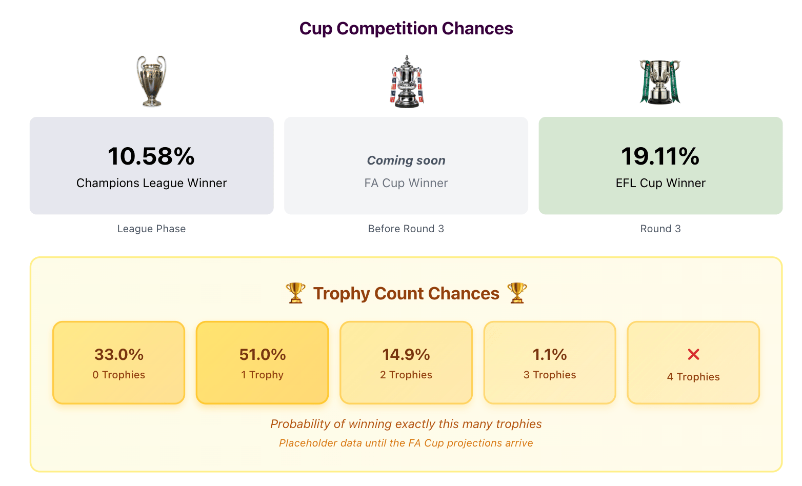 Now we have started to get the extra cup competitions involved. You’ll now be able to see something like this below the club’s other information, showing thier chances of winning any cups if they are in them. Plus the chance of them getting however many once the FA Cup data is in!