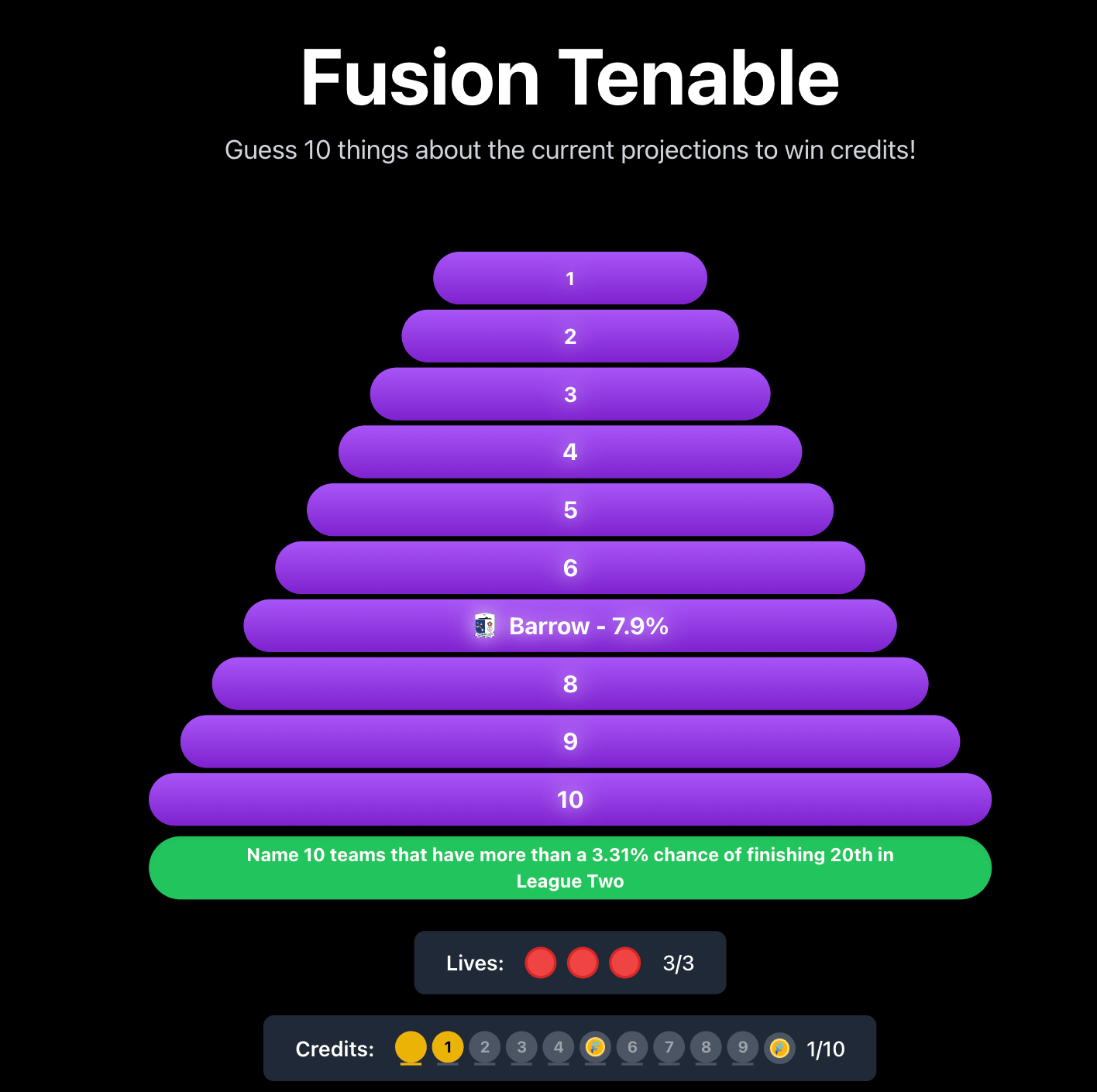 Win up to 3 credits a day if you can name all 10 teams for the day that fit into the Fusion Tennable grid! Some are super tricky, but I think it will be a great challenge for sure!