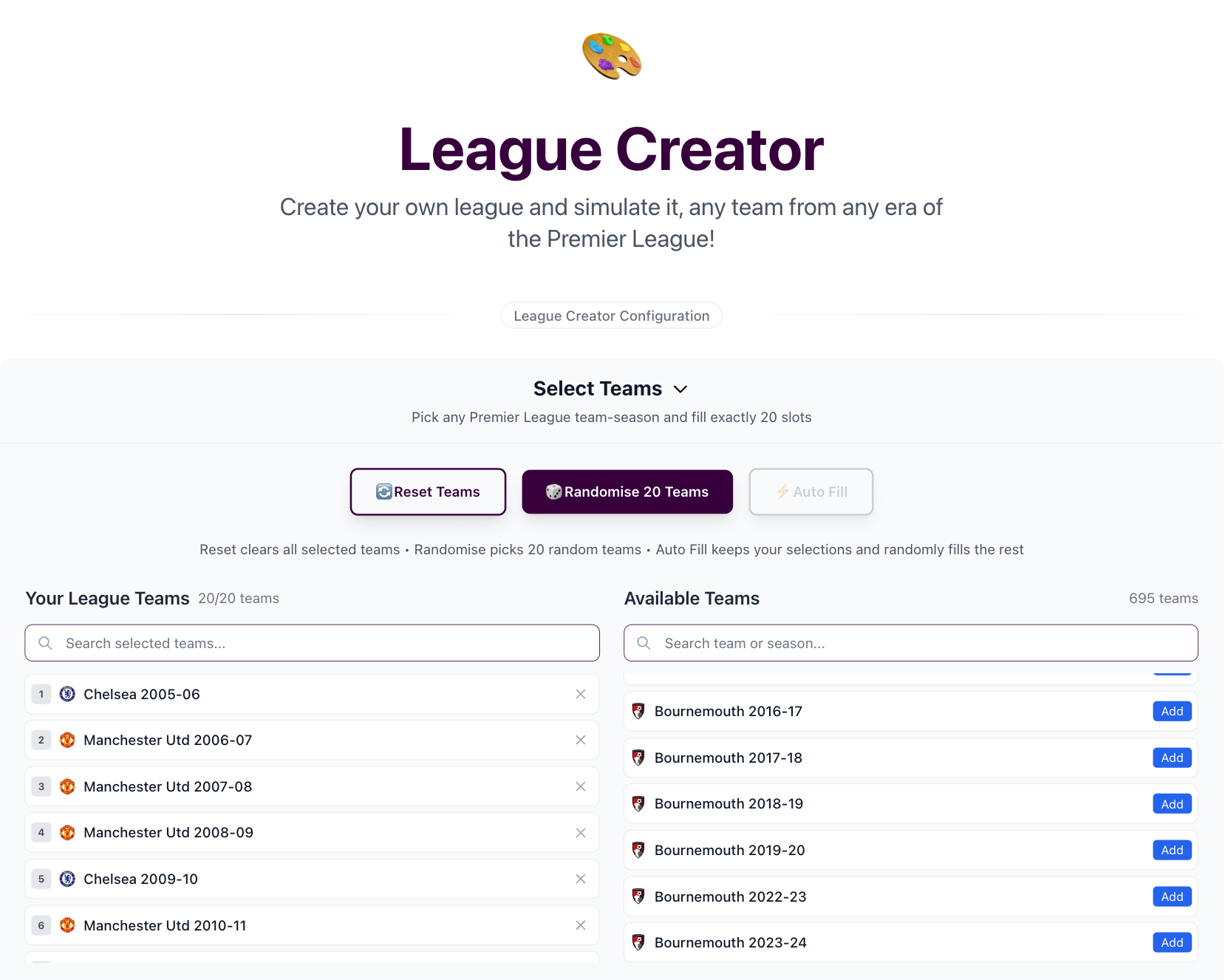 This lets you build a custom Premier League with any of the 695 Past and Present Premier league sides into one league. Maybe you want to put all the best Manchester United sides into one league? Or have the 20 worst sides in history battle it out. This page allows you to do that.