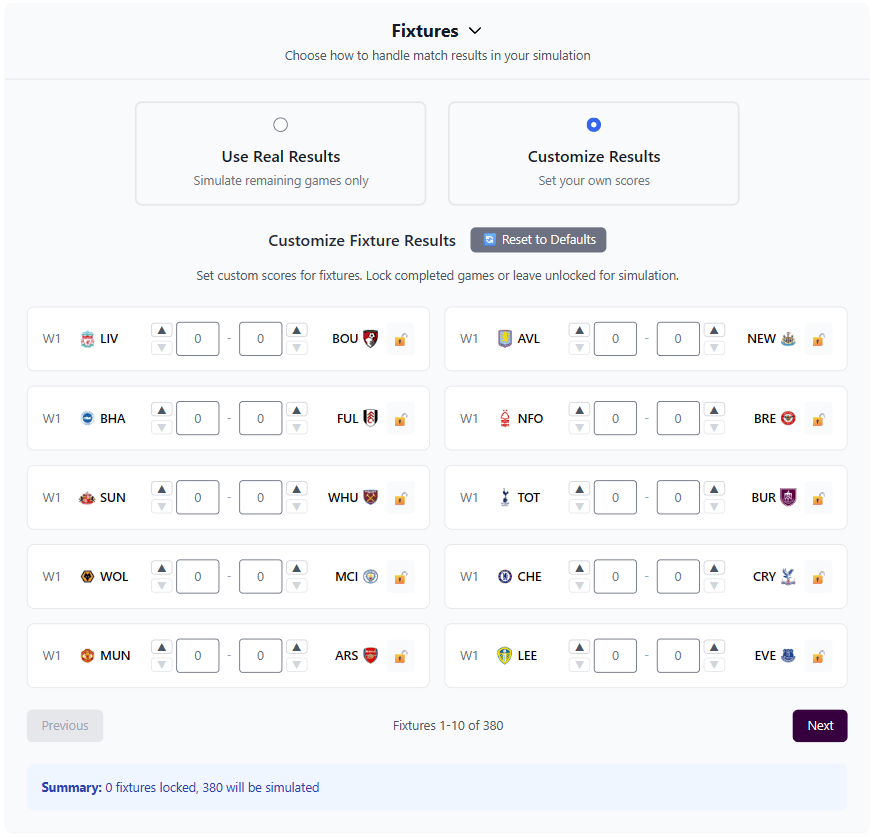 By default, you can use the real results and the generator will only simulate the unplayed games. However, if you want, you can even unlock the played games and change the scores so you can fully customise the simulation. Of course, you can also set future scores too!