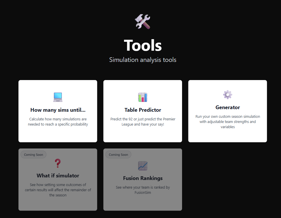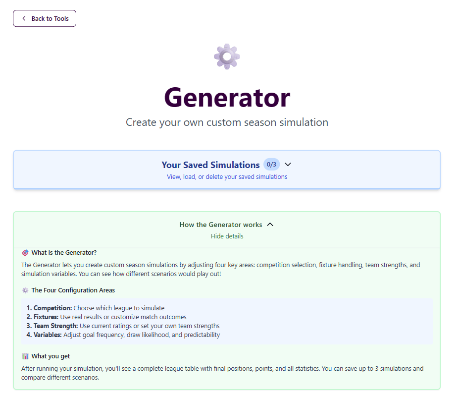 The ‘Generator’ is a new page on the tools page which, as the sub-heading says, allows you to run your own custom season simulations, with adjustable team strengths, fixtures and variables!