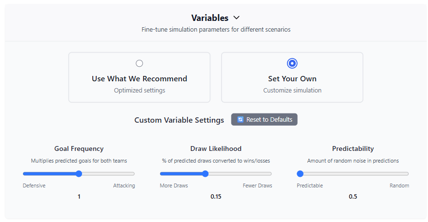 Finally, you can set the variables like the goal frequency, draw likelihood and the predictability all to make your simulation truly unique.