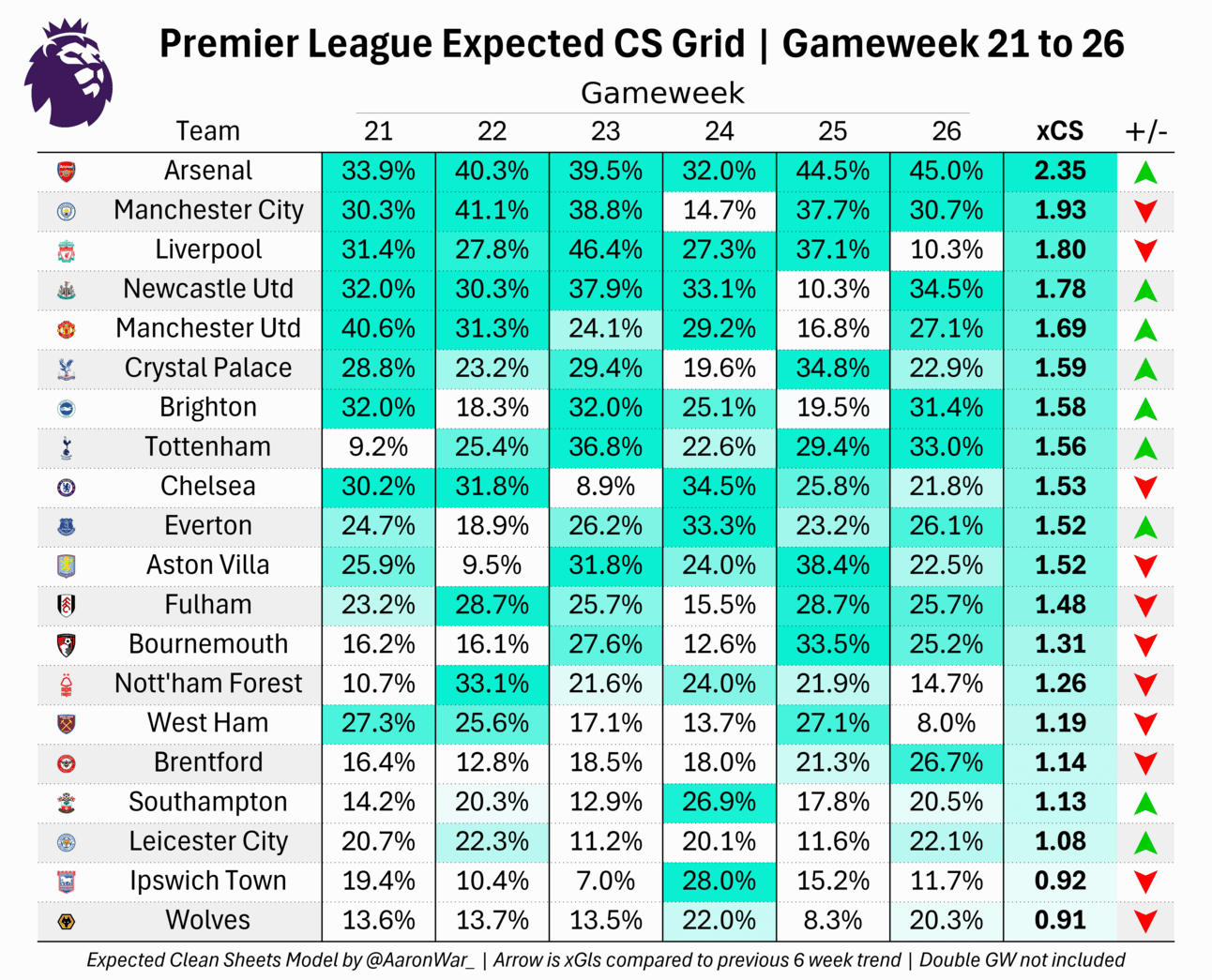 Elsewhere the model gives Tottenham the lowest chance at a clean sheet in gameweek 21 as they play away to Arsenal. Currently, this sits at just 9.2%. The most likely clean sheet of the gameweek coming from Manchester United as they play a Southampton side who have scored just 5 goals away from home this season.