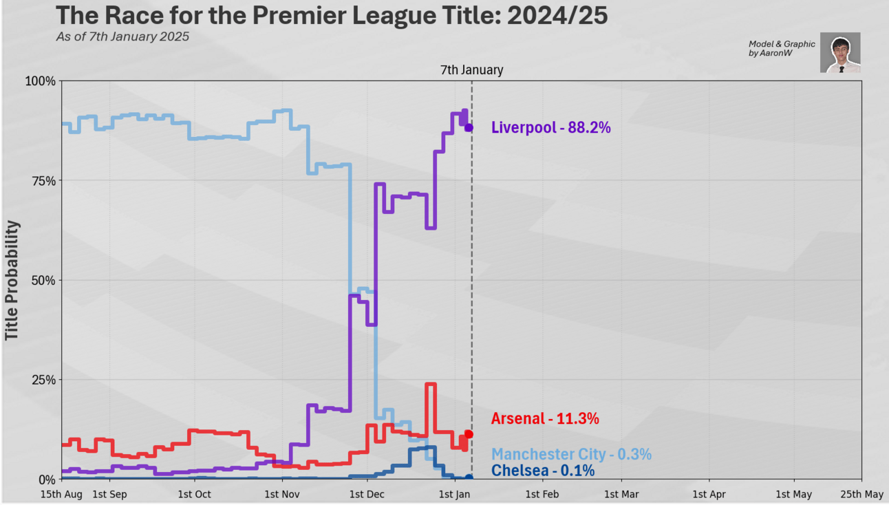 Liverpool where as high as 92.3% after Arsenal drew 1-1 with Brighton but with them failing to beat a struggling Manchester United the chances have stayed pretty similar to last week. However, with Liverpool facing an in-form Forest, any more dropped points could add another massive swing in the chances.