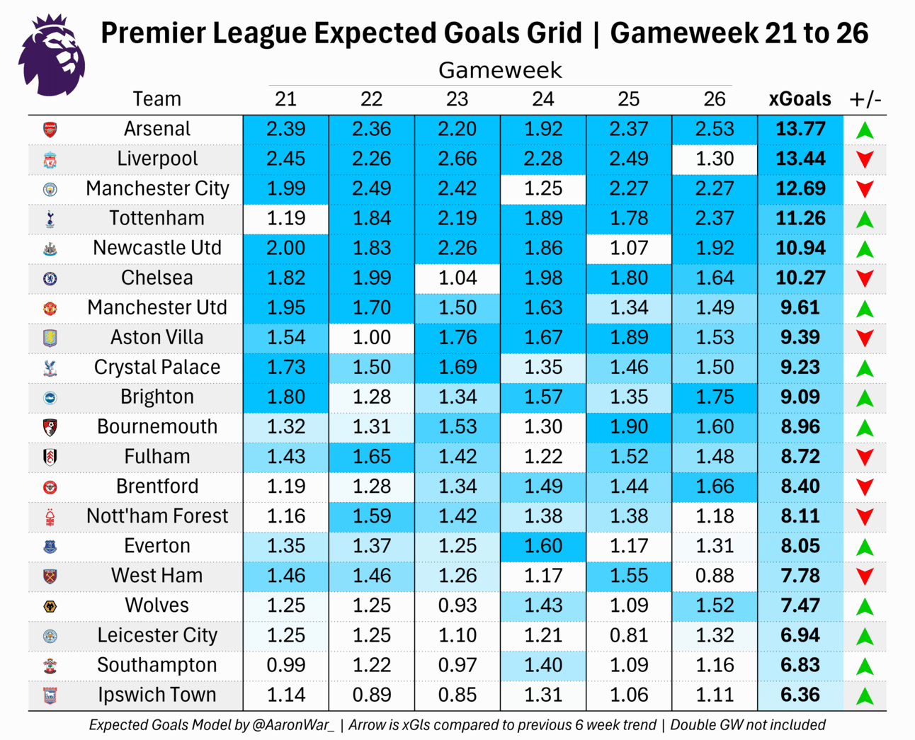 However, defensively speaking they are still the best team in the league having just an xGA of 17.8 over 20 matches played which is just in front of Liverpool with an xGA of 17.7 over 19 matches.