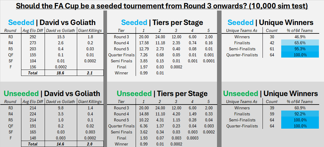 As expected a seeded FA Cup would also protect the Premier League sides much more as of the 20 Premier League sides just 2.42 get eliminated in Round 3 compared to 5.12.