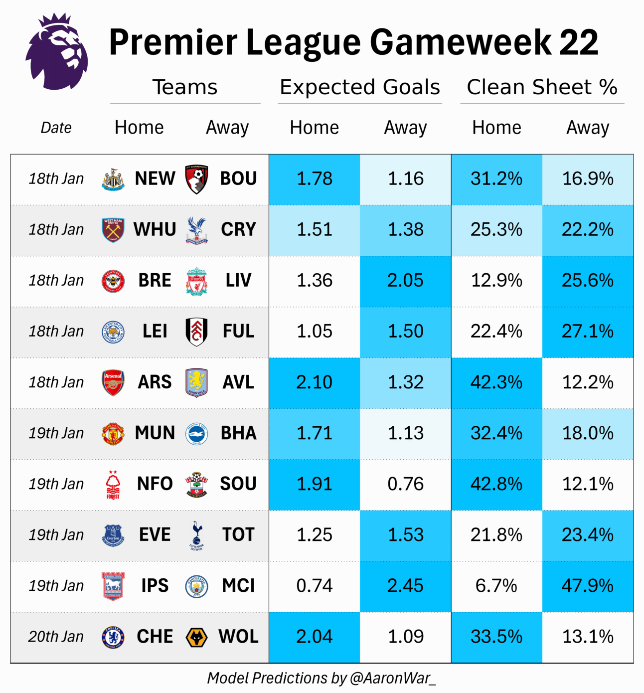 Elsewhere, Manchester City has the highest projected goals, with 2.45 away to Ipswich. Ipswich is projected to have just a 6.7% chance of keeping a clean sheet.
