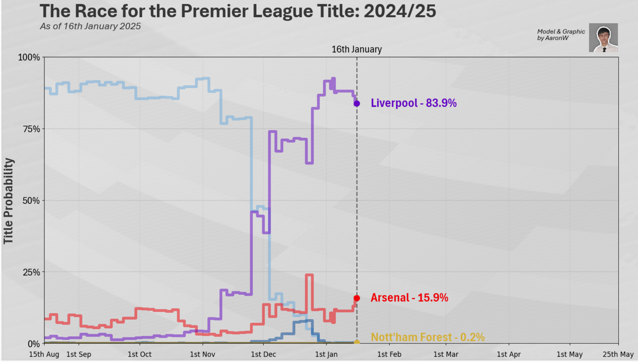 Nottingham Forest enters the title race plot for the first time! Now winning the Premier League in 0.2% of the 10,000 simulations. Manchester City for the first time fully dropped out of the plot, with their chance now below 0.1%.