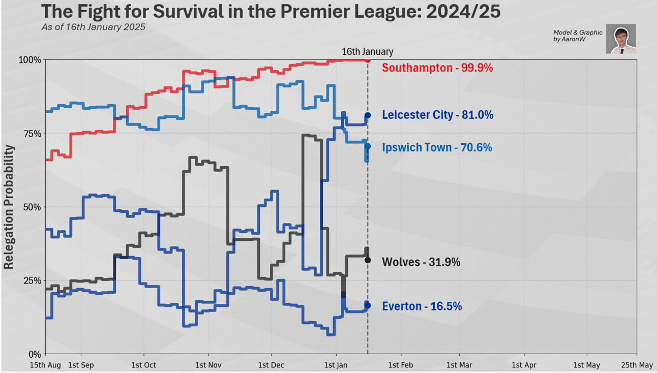 Southampton are now relegated in all but 7 of the 10,000 simulations. Ipswich will still need some big results to go their way to survive and with Man City up next that big win does not look likely to come from there.