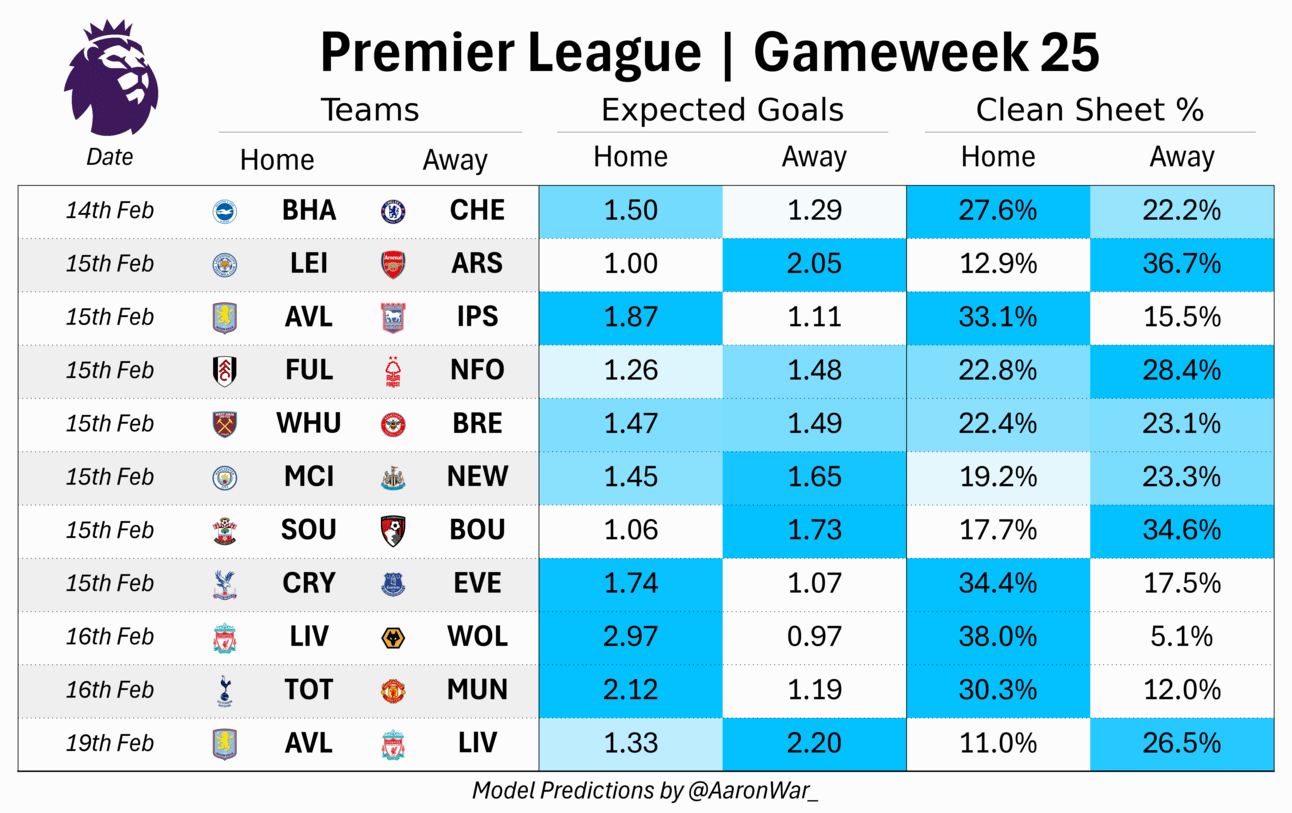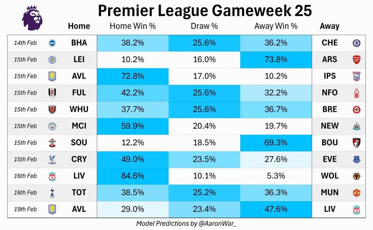 This however comes straight from my Premier League Model which simulates each season 10,000 times. So the percentages seen here are how often each team wins each game in the 10,000.