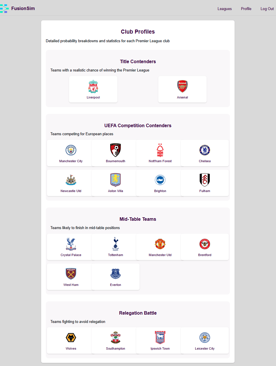 It breaks down teams into different categories based on their chances and then by clicking any club you can see the club profile!
