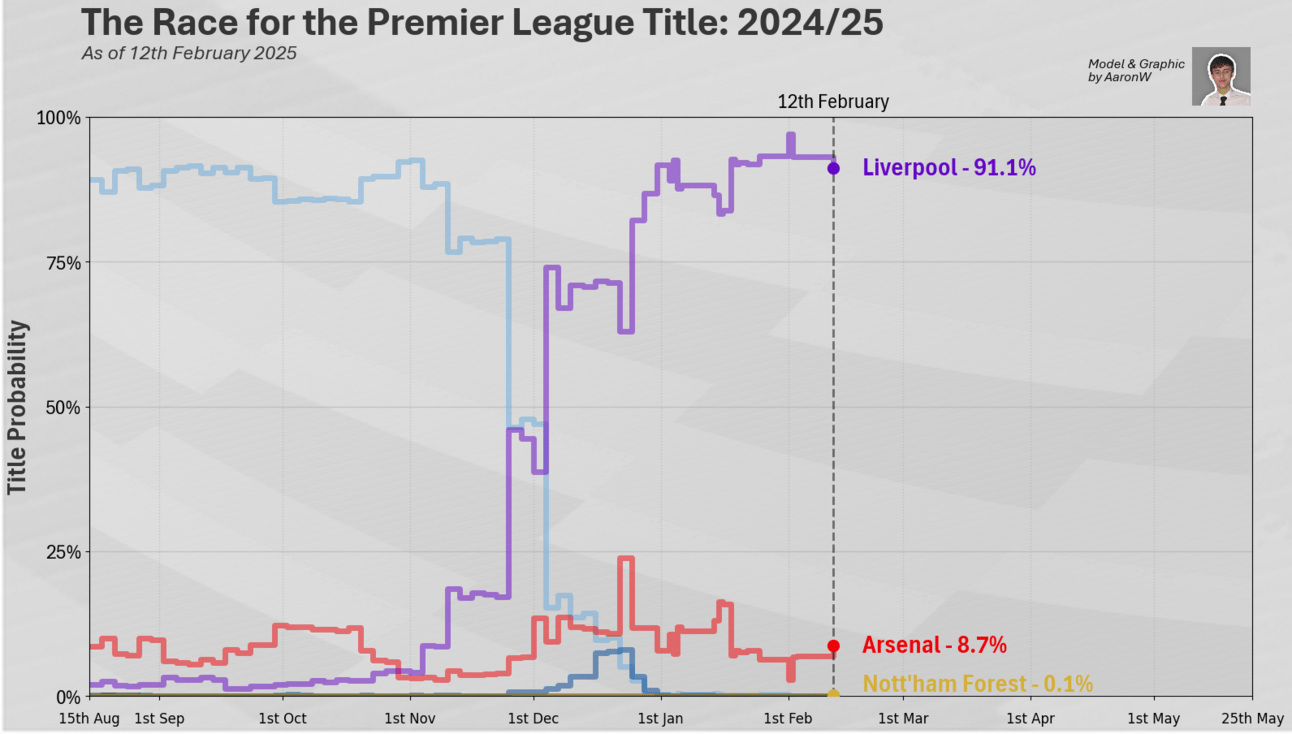 Nottingham Forest enters the plot again, the wins exactly 0.11% of my Models 10,000 simulations, it’s not at all likely, but it is possible…
