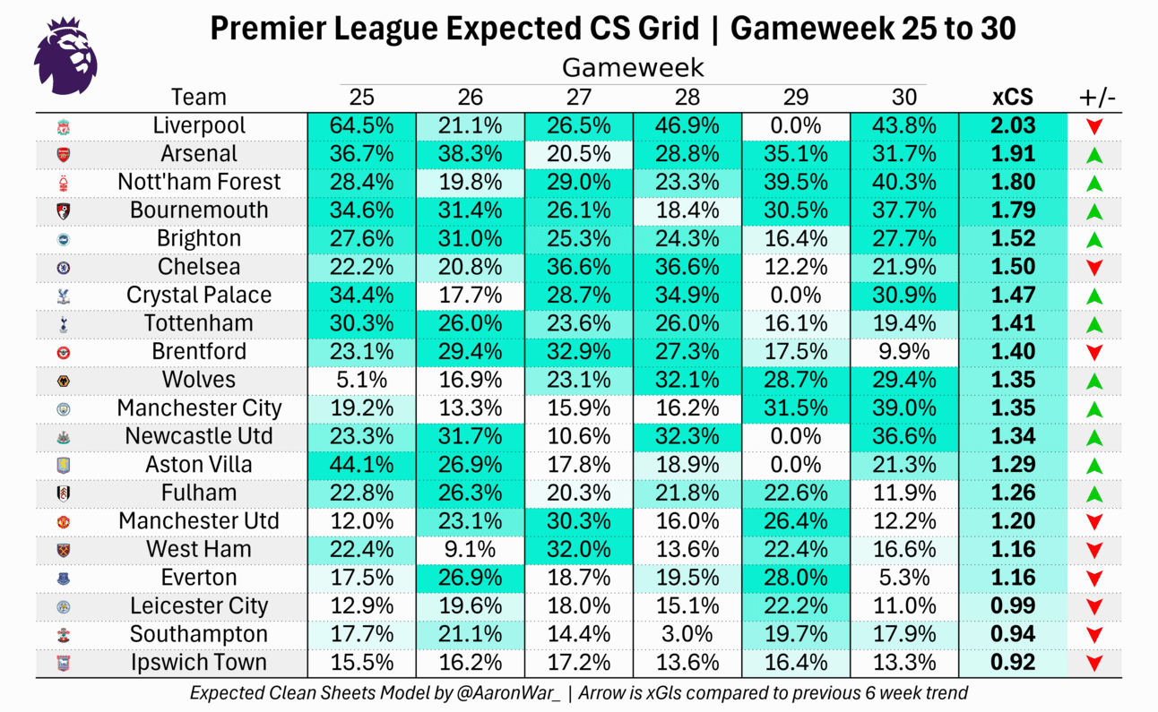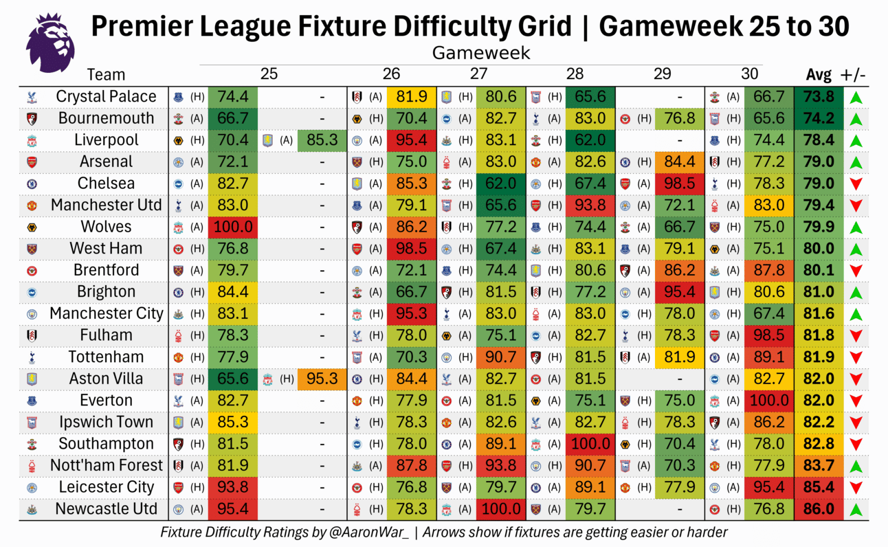Crystal Palace and Bournemouth remain to have the easiest run over the next 6 weeks, so if you’re an FPL player, Bournemouth seems ones to target given they don’t blank in gameweek 29.