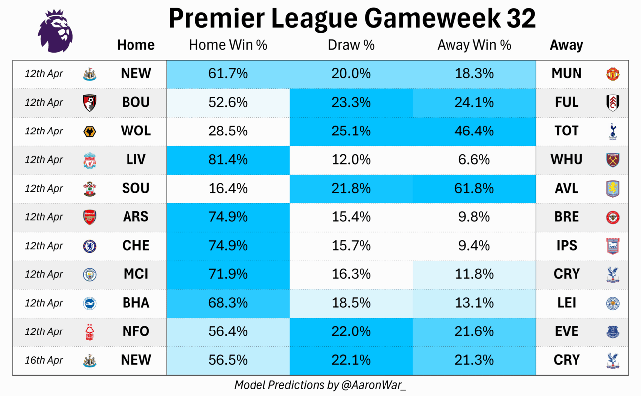 The largest of which is Liverpool beating West Ham in 81.4% of sims, meaning that the model is projecting them to bounce back from last weekend’s loss.