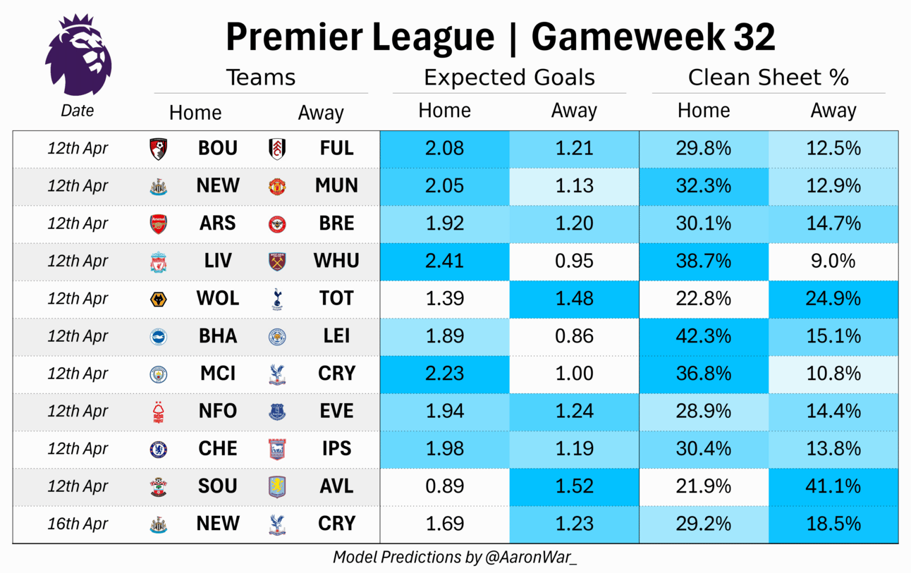As expected, the teams playing both Southampton and Leicester have the most likely clean sheets of the weekend, with Brighton at 42.3% and Aston Villa at 41.1%.