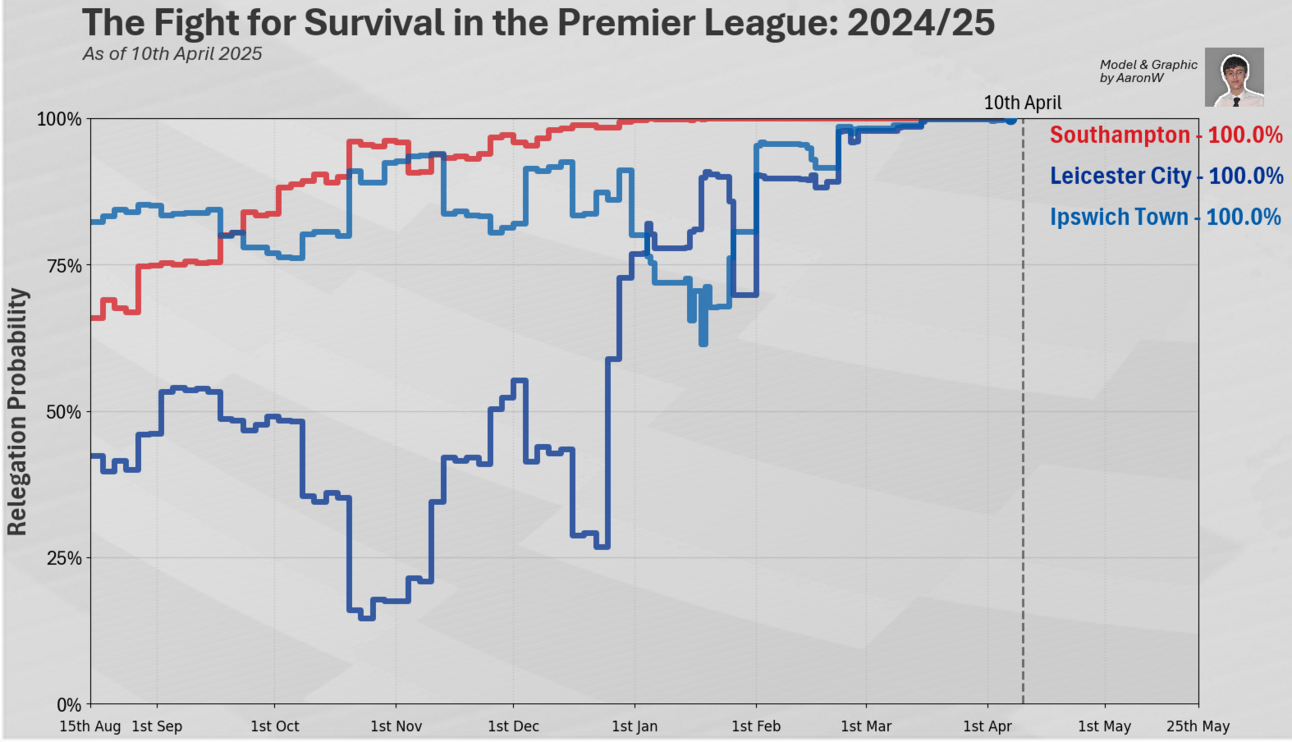 All 3 newly promoted sides are now relegated in 99.99% of 10,000 sims despite all being 100% on the plot. Ipswich are the only side to survive and they stay up in 1 of the 10,000 sims with Wolves going down in that sim.