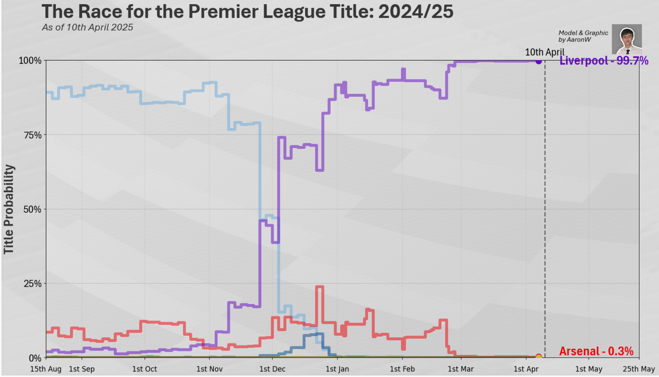 Despite losing to Fulham, Liverpool’s title chance fell to 99.7% so still incredibly likely that they win the Premier League title.