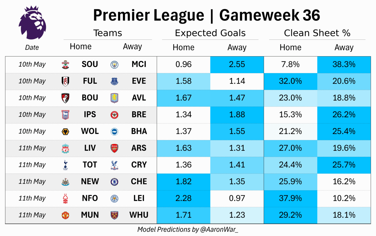 Manchester City's attacking threat is the standout narrative of Gameweek 36. The model predicts a massive 2.55 expected goals away against Southampton, the highest of any team this week by a significant margin. Southampton's dismal 7.8% clean sheet projection further reinforces the likelihood of a difficult day at the office for their defence.