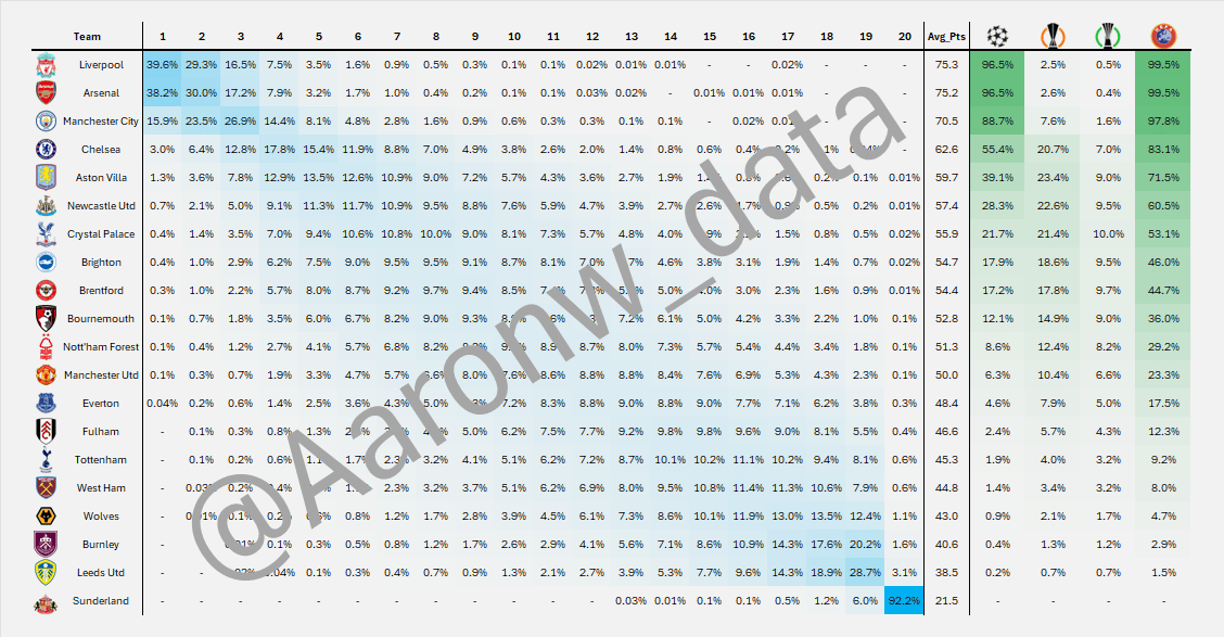 Sunderland are relegated in 99.3% of 10,000 sims. Finishing last in 92.2% of them!