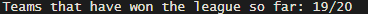 Currently, my 2025/26 code is running, trying to find a season in which every single team has won the Premier League, and we are still stuck at 19/20 teams. No awards for guessing which team it has not found yet! (Sunderland!)
