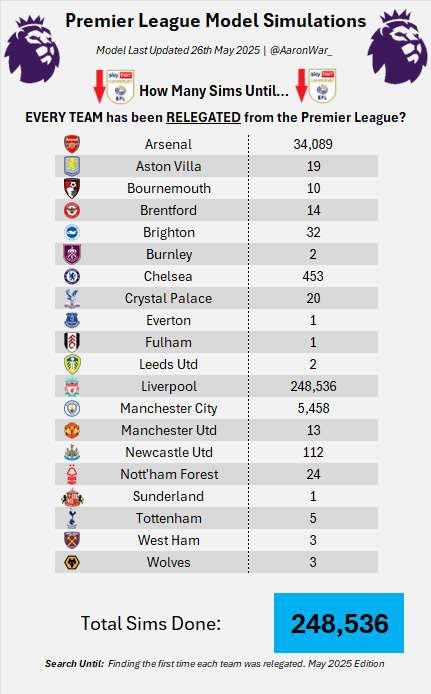 However, yesterday we did complete the number of sims needed to see every team at least relegated once from the Premier League