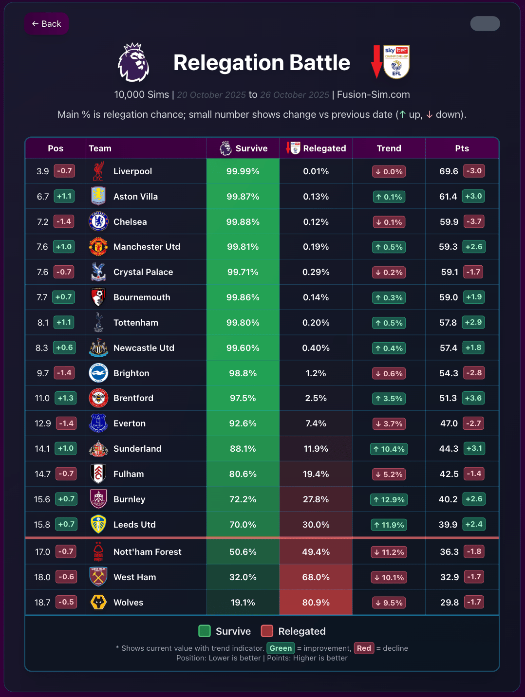 Sunderland winning again, puts them now at 88.1% chance of surviving the Premier League. Wolves now at 80.9% chance of being relegated…