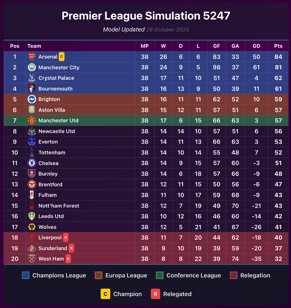 Somehow, Burnley now pick up 1 Premier League title in 10,000 sims. So I guess we could say it’s around the same chance Burnley win the Premier League as Liverpool get relegated.