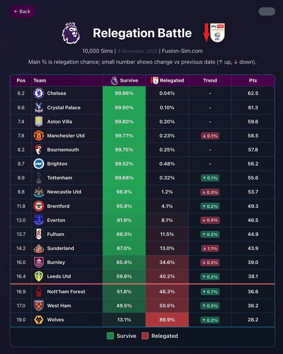 Wolves seem almost certainly down at this point with thier chance of surviving the Premier league set at just 13.1%. West Ham's upset win against Newcastle has at least given them a fighting chance of survival.