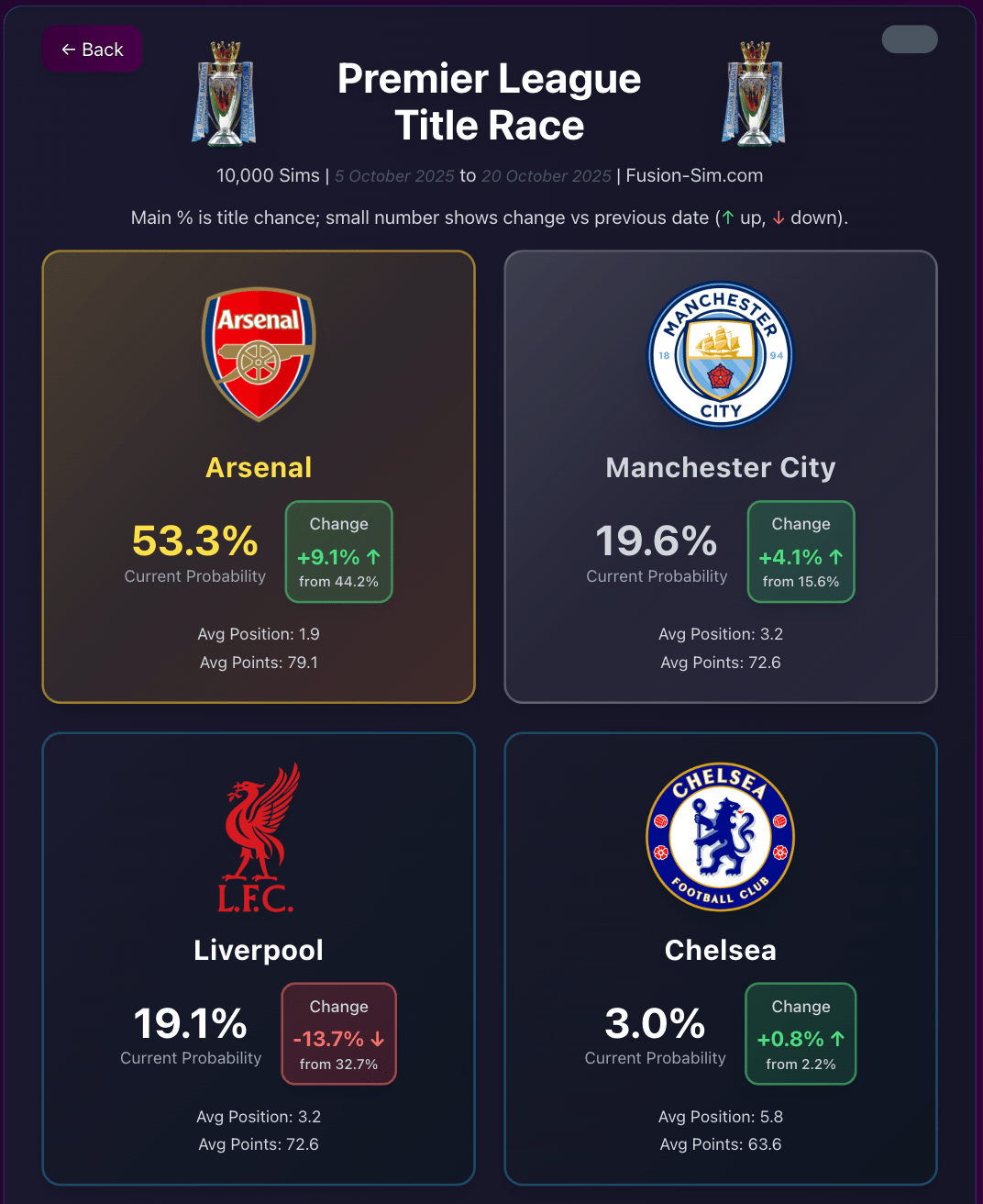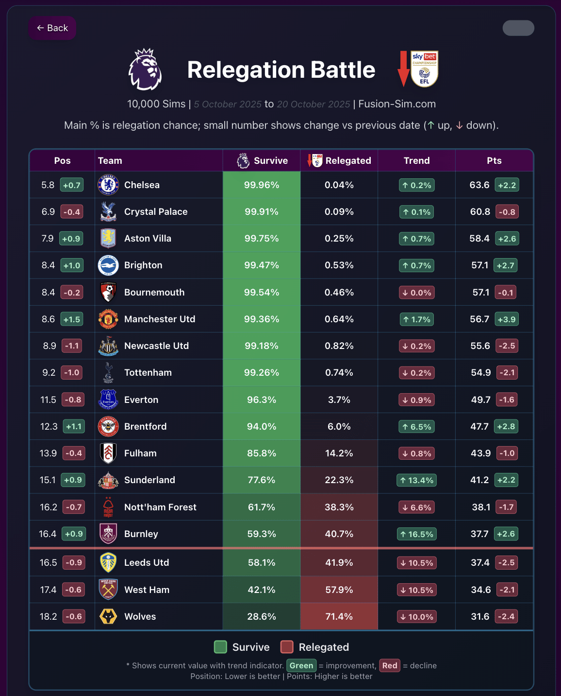 Sunderland is now 77.6% likely to survive the Premier League! That’s up over 50% from the start of the season. They have been by far the biggest surprise so far.