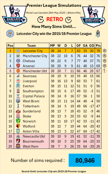 Like How many sims until Leicester City won the Premier League in 2015/16